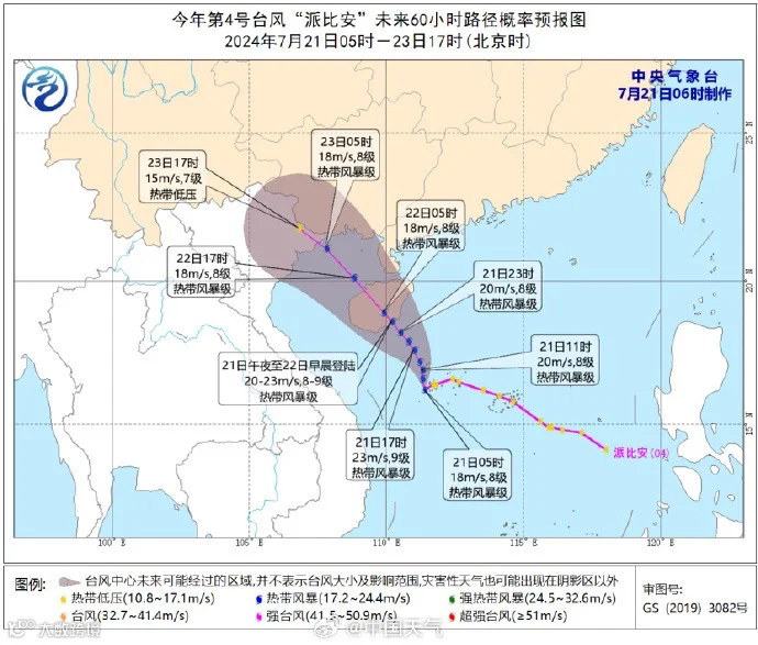 大风预报:7月21日8时至22日8时,南海大部、北部湾、广东西部沿海、海南岛沿海、中沙群岛、西沙群岛、南沙群岛将有6-7级风,阵风可达8-9级,“派比安”中心经过的附近海面和地区风力可达8-9级,阵风10级。