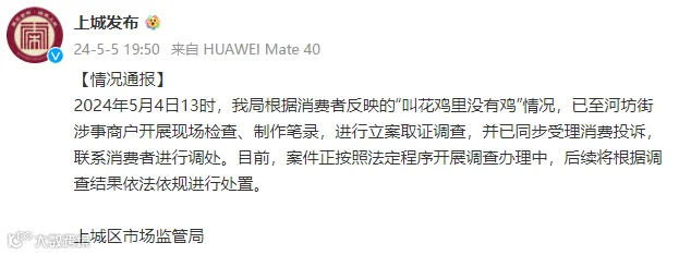 5月5日晚,上城区市场监督管理局发布通报,针对“叫花鸡里没有鸡”的情况,已对涉事商户进行立案取证调查。