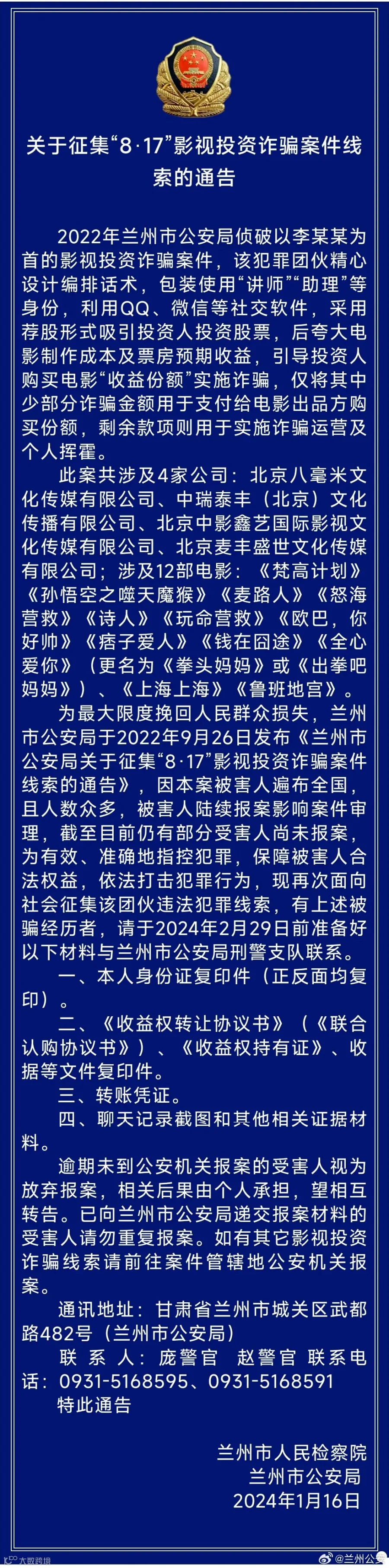 1月16日,兰州市人民检察院、兰州市公安局联合发布通告称,2022年,兰州市公安局侦破以李某某为首的影视投资诈骗案件,该犯罪团伙精心设计编排话术,包装使用“讲师”“助理”等身份,利用QQ、微信等社交软件,采用荐股形式吸引投资人投资股票,后夸大电影制作成本及票房预期收益,引导投资人购买电影“收益份额”实施诈骗,仅将其中小部分诈骗金额用于支付给电影出品方购买份额,剩余款项则用于实施诈骗运营及个人挥霍。