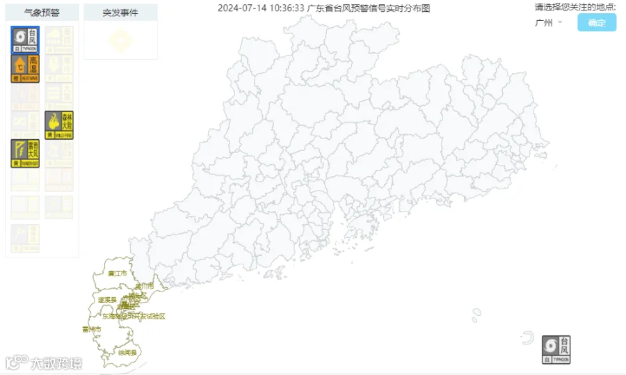 7月13日傍晚起,受南海南部热带低压影响,广东雷州半岛地区各市县区已陆续发布台风白色预警信号。截至7月14日10:12,粤西已经有6个市县区台风白色预警信号生效中。广东省气象部门预计,15日起影响广东的雨势将有所加大。
