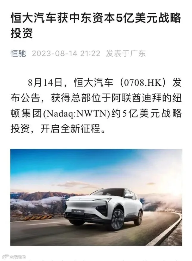 纽顿集团计划向恒大汽车注资的合作,需追溯到去年8月。当时,恒大汽车称获得总部位于阿联酋迪拜的纽顿集团约5亿美元战略投资,并表示“此次牵手中东资本,将有效解决恒大汽车发展面临的资金难题”。据悉,所有战投资金全部用于恒大汽车天津工厂,确保恒驰5的正常生产和恒驰6、7的陆续量产。