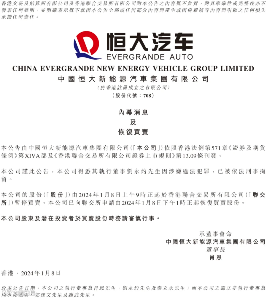 今天(1月8日)中午12时20分,恒大汽车在港交所发布“内幕消息”称,该公司得悉执行董事刘永灼先生因涉嫌违法犯罪,已被依法刑事拘留。