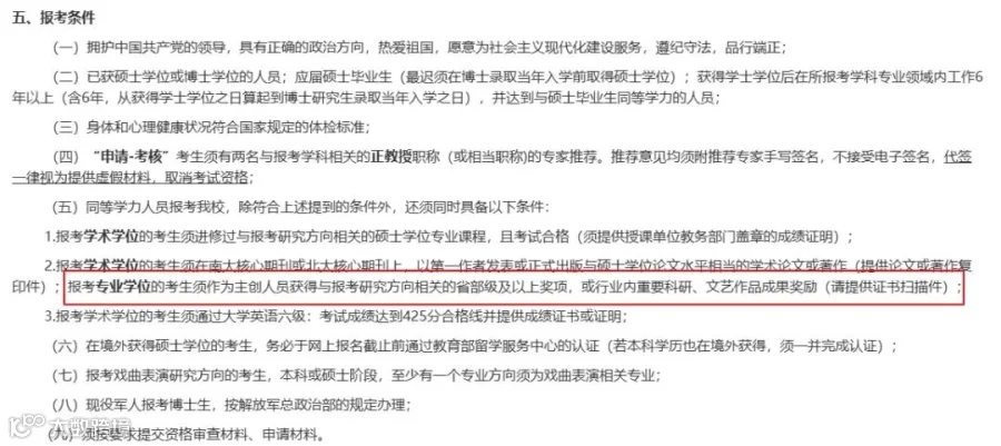 据了解,报考专业学位的考生须作为主创人员获得与报考研究方向相关的省部级及以上奖项,或行业内重要科研、文艺作品成果奖励。
