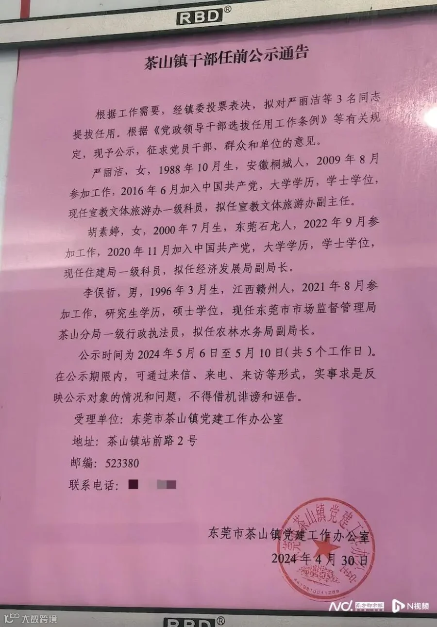 日前,网络流传的一份《茶山镇干部任前公示通告》显示,东莞一位“00后”干部胡素婷,2022年参加工作,2024年4月公示,拟任茶山镇经济发展局副局长。