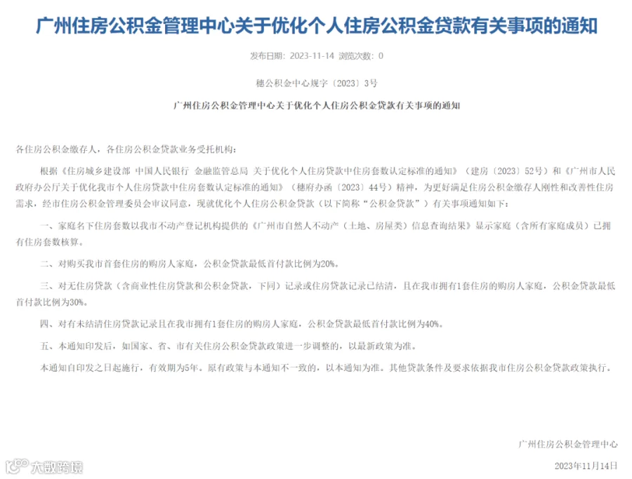 11月14日,广州住房公积金管理中心发布《广州住房公积金管理中心关于优化个人住房公积金贷款有关事项的通知》(以下简称《通知》),对住房套数认定标准、公积金贷款最低首付款比例等进行了优化调整。