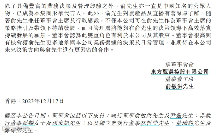 此外,东方甄选在公告中提到,除具备丰富的业务决策及管理经验之外,俞敏洪一直是中国知名的公众人物,已成为集团形象代言人。此外,俞敏洪对农产品及直播有着深厚了解。随着俞敏洪兼任董事会主席及行政总裁,不仅公司可在俞敏洪作为董事会主席的策略指引及带领下持续发展,而且管理层将能够在俞敏洪的决策领导下高效落实持续发展的愿景。董事会认为此双重角色有利于公司及其股东。董事会很高兴有机会获俞敏洪更多地参与公司业务营运的决策及日常管理,并期待在公司未来决策方向与俞敏洪进行更紧密的合作。