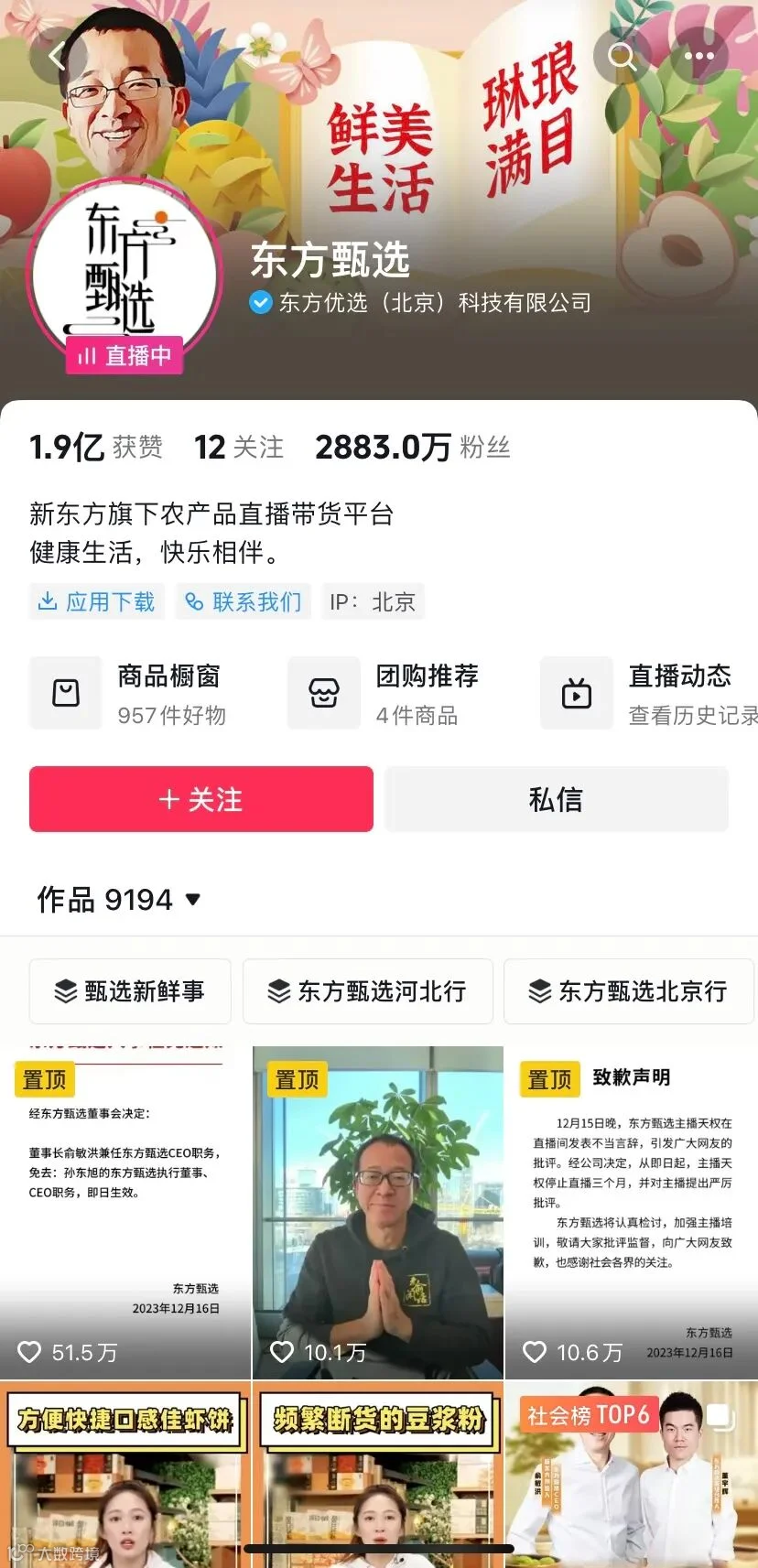 继12月16日晚董宇辉、俞敏洪“合体”亮相直播间后,12月17日晚,东方甄选在港交所再次发布公告。