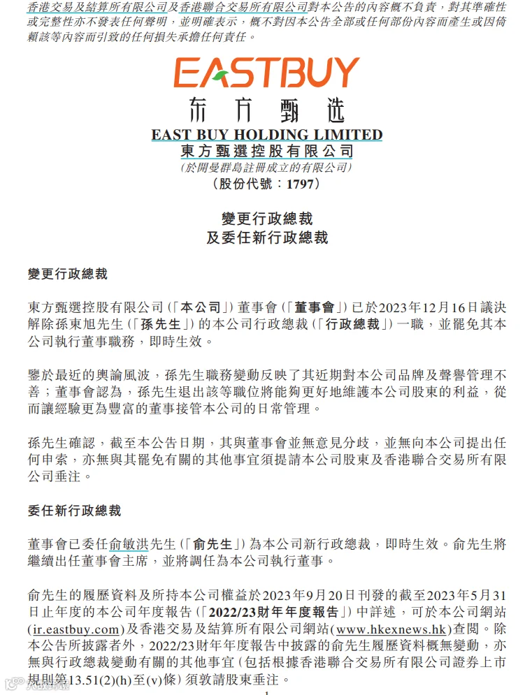 公告称,董事会已于12月16日议决解除孙东旭的行政总裁一职,并罢免其公司执行董事职务,即时生效。但孙东旭仍然留任东方甄选非执行董事。董事会已委任俞敏洪为公司新行政总裁,即时生效。俞先生将继续出任董事会主席,并将调任为公司执行董事。