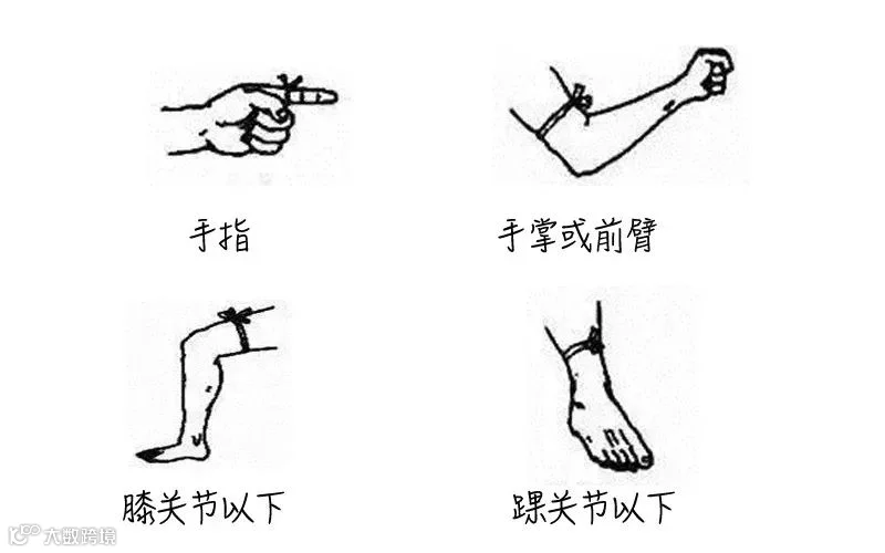 可用绳子或者把衣服撕成布条进行结扎,结扎的时候,远心端可以摸到动脉的搏动,这种松紧度,和平时在医院抽血化验时,那种橡胶管绑的松紧度差不多。每半小时到1小时松开结扎3分钟。