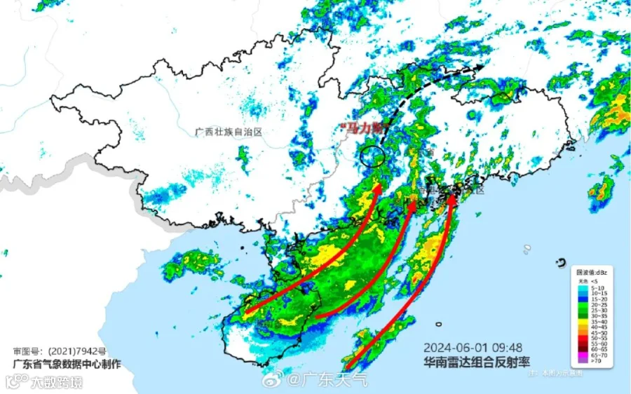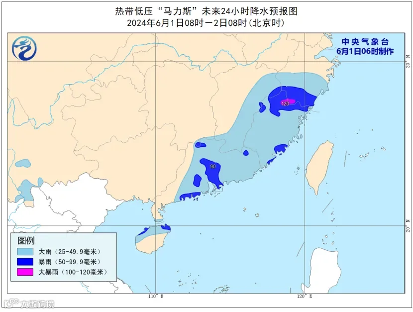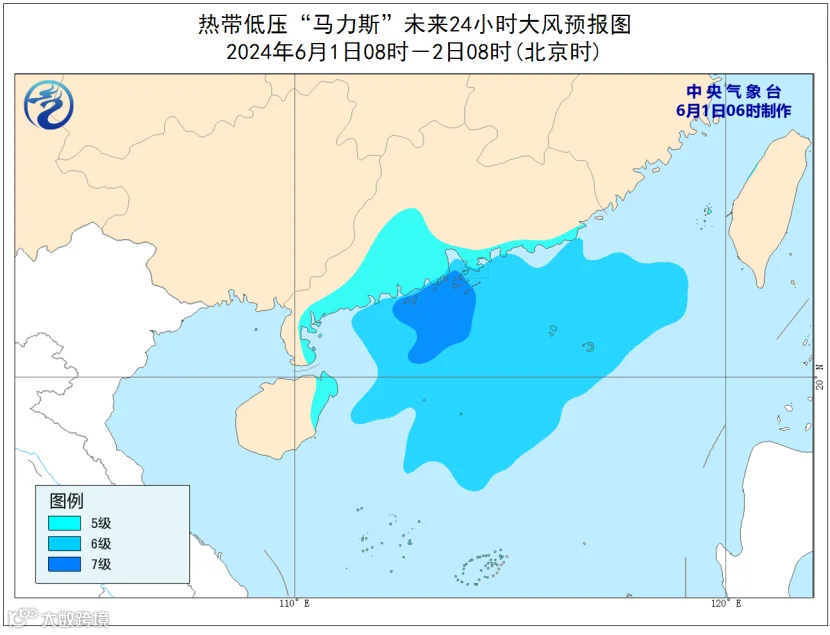 同时,6月1日,南海北部、广东海面及沿海市县有7级~9级大风。