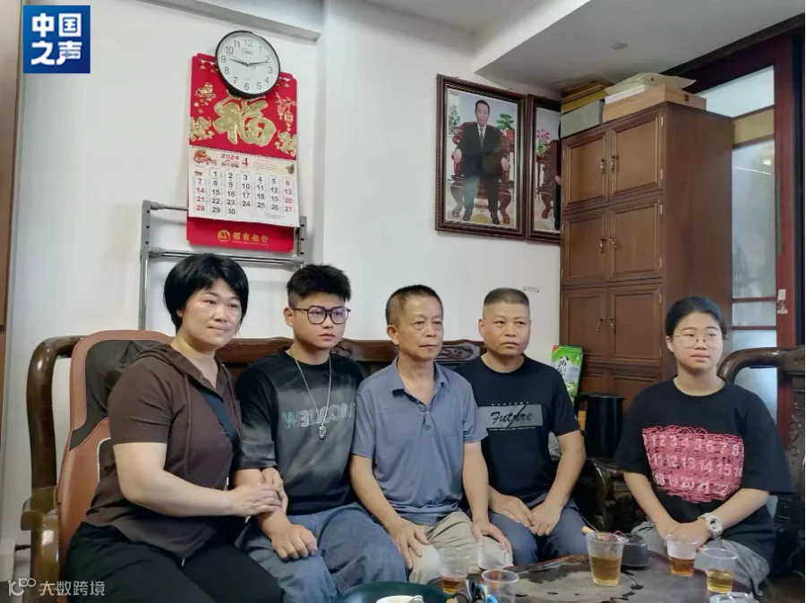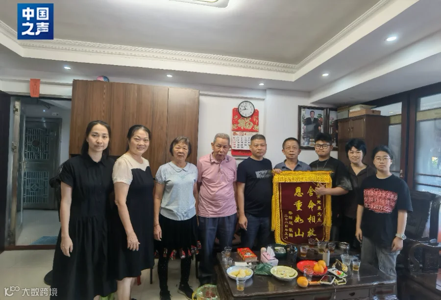 蔡炫达(右三)和家人为黄建度(右四)送上锦旗。