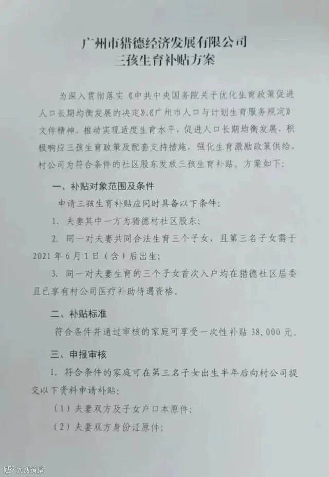 近日,一则“广州市猎德经济发展有限公司三孩生育补贴方案”在网络上流传,方案中称,村公司为符合条件的社区股东发放三孩生育补贴,通过审核可享受一次性补贴38000元。对此,猎德村公司相关人士回应称,“这个还没有官方公布的,具体要留意官方公布。”