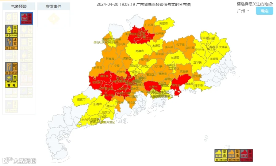 广东省暴雨预警信号分布图(截至4月20日19:05)