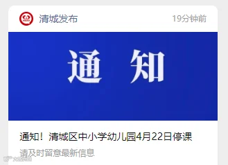 清新区教育局发布通知,经研究决定4月22日(星期一)龙颈、禾云、浸潭、石潭四镇中小学校、幼儿园停课一天,校外培训、托管机构停止服务,寄宿制学校做好在校师生员工的安全保障工作。太和(含中心城区直属学校)、山塘、太平、三坑四镇暂不停课。请各镇、各校切实做好师生安全工作。