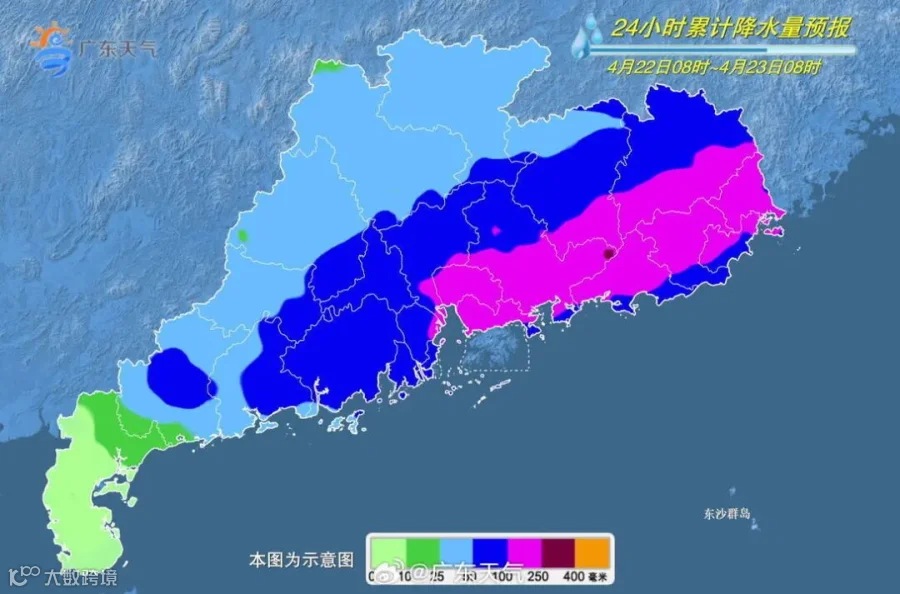 21日-22日广东仍有连续性强降水,粤北、珠江三角洲、粤东市县先后有暴雨到大暴雨局部特大暴雨,雷雨时部分市县伴有8~11级短时大风和小冰雹;24日夜间起,广东又有明显降水过程。