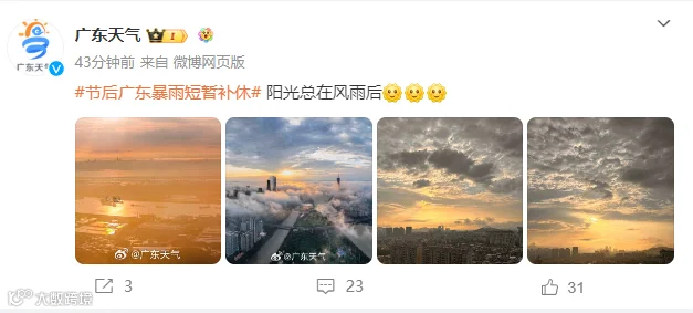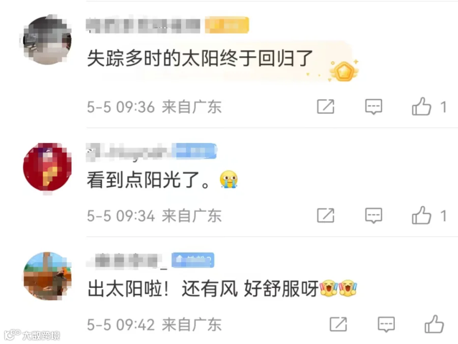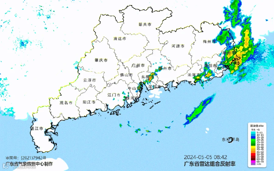 据@广东天气 5月5日消息,广东降雨趋于减弱。5日下午到夜间,韶关、河源、梅州、珠三角北部有中雨局部暴雨;其余市县阵雨转多云。