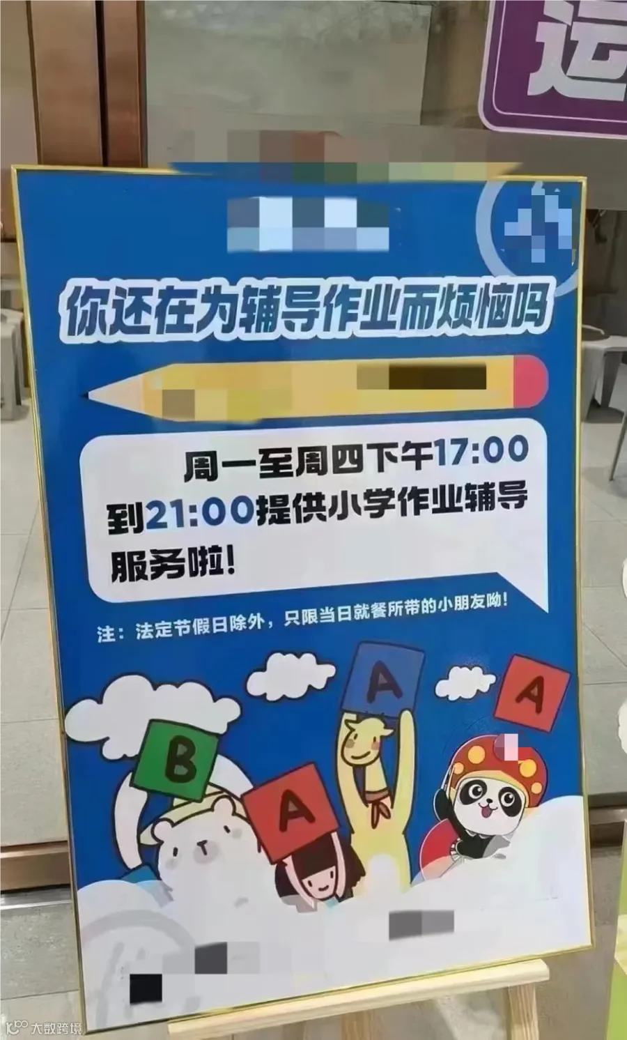 “你还在为辅导作业而烦恼吗?周一至周四17:00-21:00提供小学作业辅导服务啦!”
