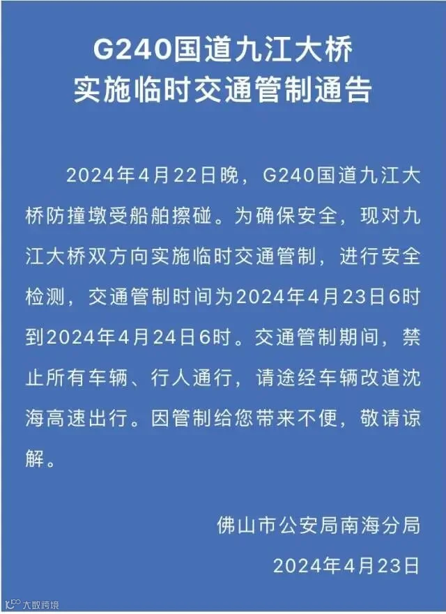 4月23日清晨,佛山市公安局南海分局发布《G240国道九江大桥实施临时交通管制通告》称,4月22日晚,G240国道九江大桥防撞墩受船舶擦碰。为确保安全,现对九江大桥双方向实施临时交通管制,进行安全检测,交通管制时间为2024年4月23日6时到2024年4月24日6时。