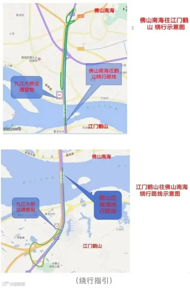 佛山市公安局南海分局还发布了佛山南海往江门鹤山、江门鹤山往佛山南海两个方向的绕行示意图: