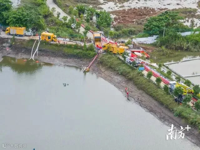 傍晚,记者在现场看到,救援车辆在不断进行抽水,通过降低池塘水位让鳄鱼现身,从而进一步进行抓捕,位于救援核心区域的浸水量则非常大,多个抽水管被放入池塘,救援人员正在加足马力。