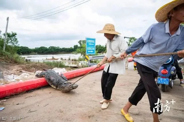 附近村民陈大叔告诉记者,今天(13日)早上看到抓到了一条鳄鱼,“抓到一条就会拉走一条。”他说,在这次水淹前,村民们都已经知道附近有鳄鱼养殖场,此前都是用铁皮围着的,对大家的生活没有什么影响。