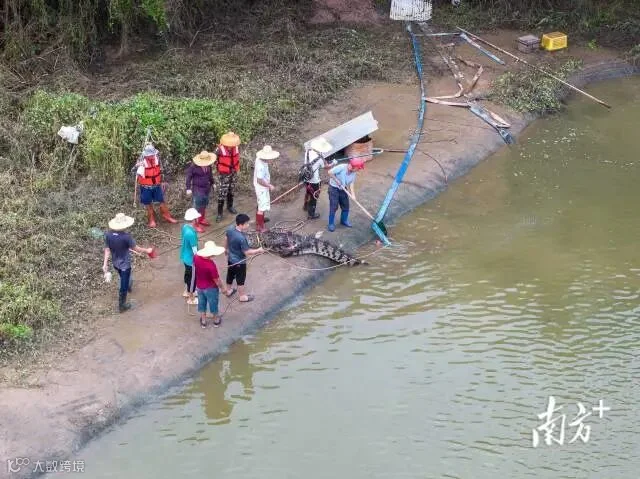 当地农业农村部门介绍,连续的暴雨让鳄鱼养殖场的围墙出现两个决口,事件发生后,公安、消防、水务、应急以及捕鳄鱼队伍等专业力量到达现场,第一时间补好决口,防止养殖场内的鳄鱼继续外逃,随后在养殖场周边开展24小时不停歇的地毯式搜查工作,发现鳄鱼后第一时间进行捕捉。