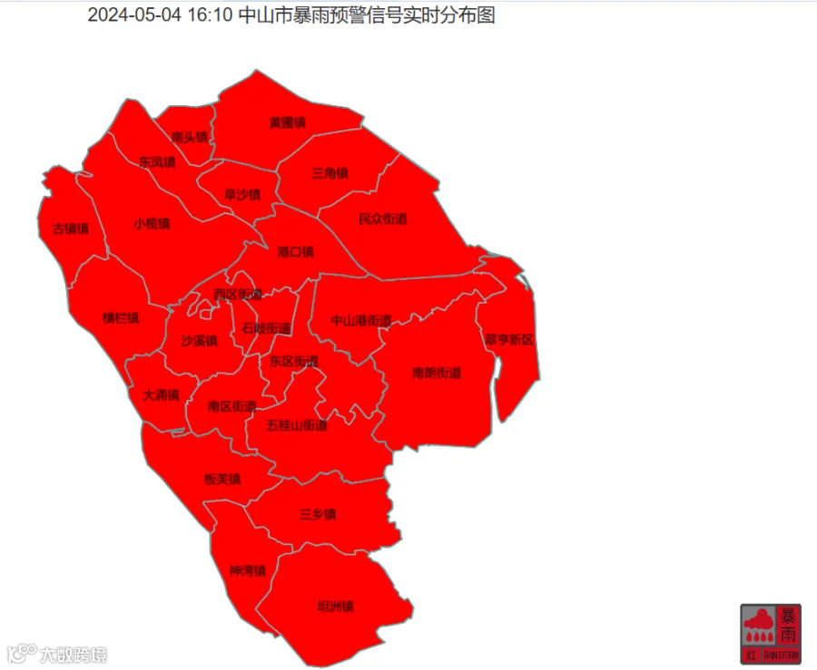 预计未来1-3小时,中山市雨势进一步加强,中山市气象台2024年5月4日16时5分发布全市暴雨红色预警信号,请做好各项防御工作。