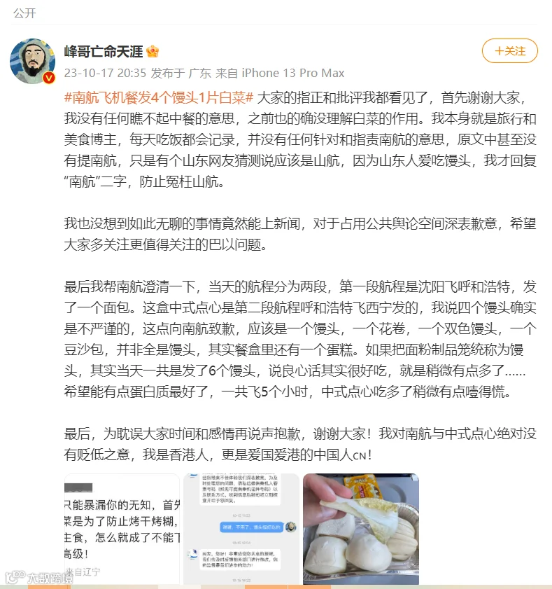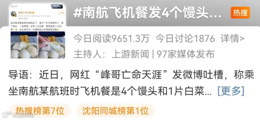 10月17日,#南航飞机餐发4个馒头1片白菜#的话题登上热搜。