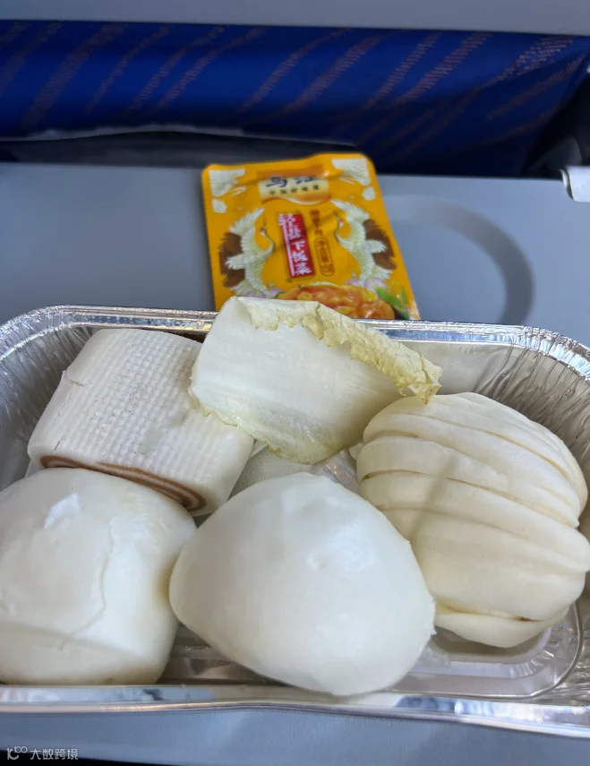 文中还表示,当天的航程分为两段,第一段航程是沈阳飞呼和浩特,发了一个面包。这盒中式点心是第二段航程呼和浩特飞西宁发的,说四个馒头确实是不严谨的,这点向南航致歉,应该是一个馒头,一个花卷,一个双色馒头,一个豆沙包,并非全是馒头,其实餐盒里还有一个蛋糕。