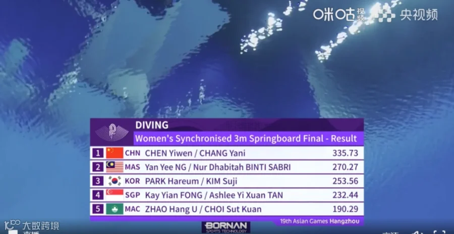 杭州亚运会女子双人3米板决赛中,陈艺文和昌雅妮两人依旧发挥稳定,一直保持着领先优势,三轮过后以335.73分的绝对优势夺冠。马来西亚组合以总分270.27分拿到银牌,韩国组合以总分253.56分获得铜牌。