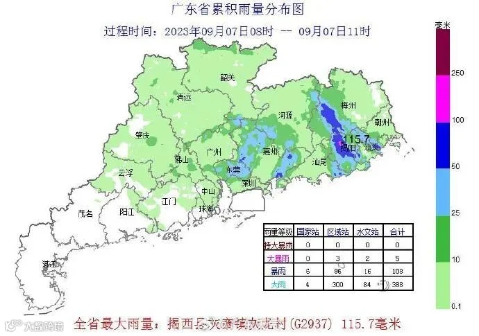 据@梅州天气消息,6日20时至7日10时全市平均雨量为54.5毫米,最大雨量为165.7毫米,出现在丰顺县八乡山镇。预计未来6小时,梅州五华、兴宁、丰顺、平远有大到暴雨,累积面雨量20-40毫米,局部50-60毫米,其余地区小到中雨,局部大雨,累积面雨量8-15毫米,局部20-40毫米。