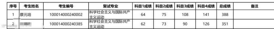 此次北京大学国际关系学院公布的复试成绩显示,在报考科学社会主义与国际共产主义运动专业的两名考生中,蔡元培的成绩为64分,另一名考生复试成绩为74分。但因为蔡元培初试成绩有较大优势,因此其最终总成绩核算后为73.52分,另一名考生总成绩为71.34分。蔡元培总成绩排名第一。