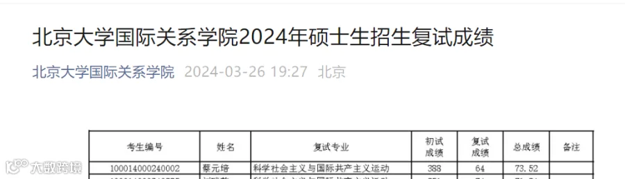 据北京大学国际关系学院3月18日公布的该院2024年硕士(内地学生)复试公示名单信息显示,考生蔡元培复试的专业是科学社会主义与国际共产主义运动。该专业共有两名考生参加复试,蔡元培的考研初试总分数是388分,比第二名考生的351分多出37分。