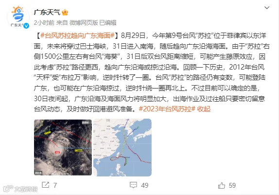 目前路径预报来看,“海葵”未来几天先以西北路径为主,向我国华东沿海靠近。8月31日后,台风“苏拉”与“海葵”可能发生互旋作用,导致路径复杂多变,广东的风险在逐渐增大,尤其是中东部沿海地区的朋友,要根据台风动态提前做好防御准备。