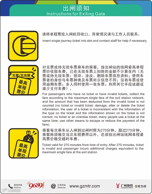 根据广州地铁的现行票务规则,广州没有所谓的“超时服务费”,不过根据广州地铁官网公布的进闸须知,“乘客每次乘车从入闸到出闸时限为270分钟,超过270分钟,乘客除须缴交当次车程费用以外,还须按出闸站线网单程最高票价缴交超时车费。”