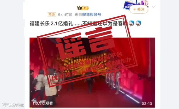 据福建省互联网辟谣平台消息,近日,有个别网络账号在社交平台上传播“福建长乐2.1亿婚礼”“老凤祥董事长儿子和