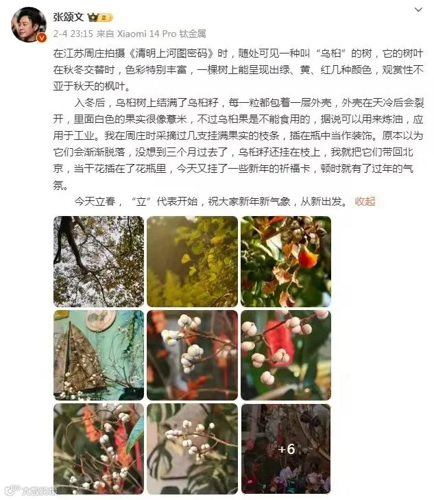 张颂文还称,他把几支挂满果实的乌桕枝条,带回北京当干花插到了花瓶里,“今天又挂了一些新年的祈福卡,顿时就有了过年的气氛”,他一并还祝网友“新年新气象”。