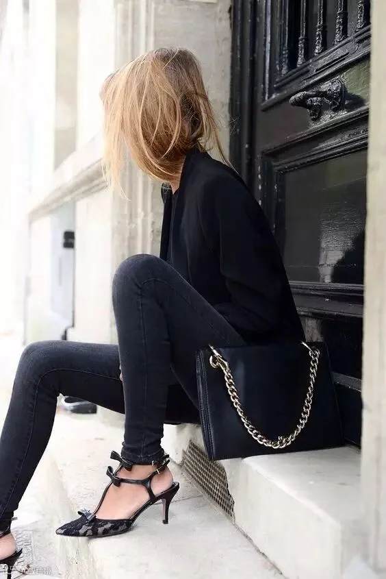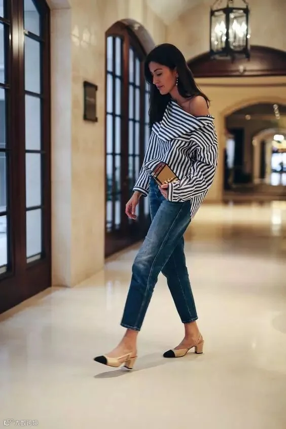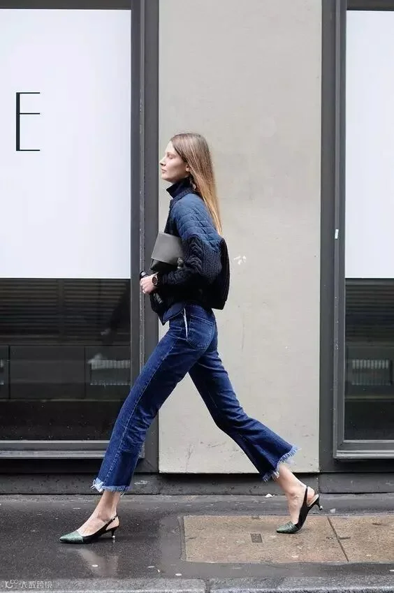 先来说低跟鞋里人气最高最时髦的款式Sling-back,什么是Sling-back?就是指有一根系带环绕在后脚跟的鞋子~低跟鞋搭上Sling-back就会变得极致优雅,我平时最喜欢搭配摩登的九分复古牛仔裤~一定要露出脚踝才会显高显瘦噢!▼