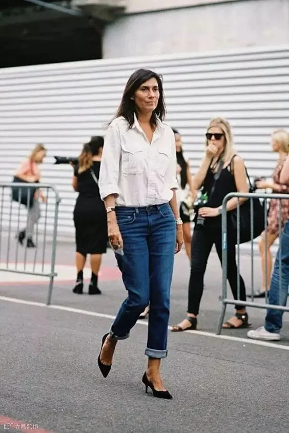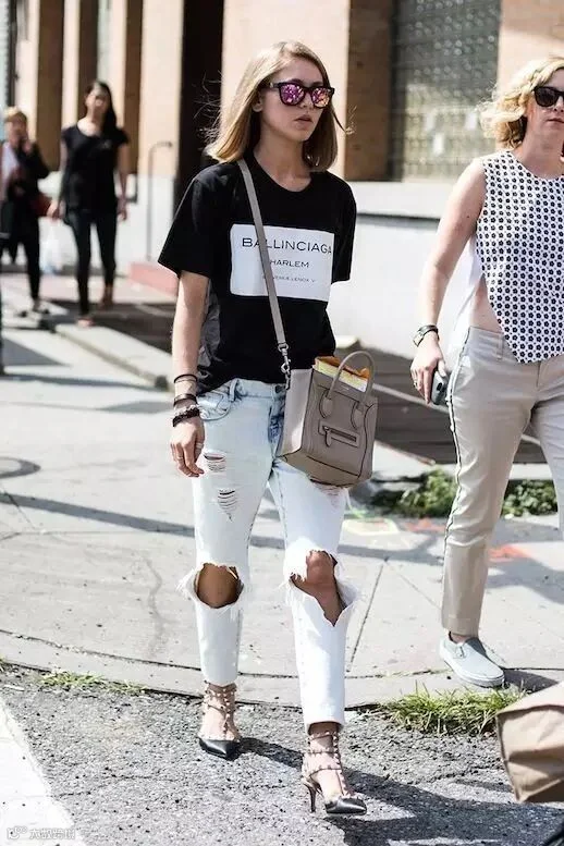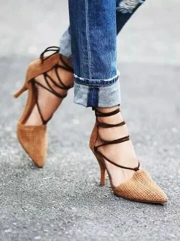 绑带的低跟鞋搭配九分裤也很时髦~比Sling-back看起来更年轻,可以选择破洞牛仔裤的款式,会更有街头混搭的风范~▼