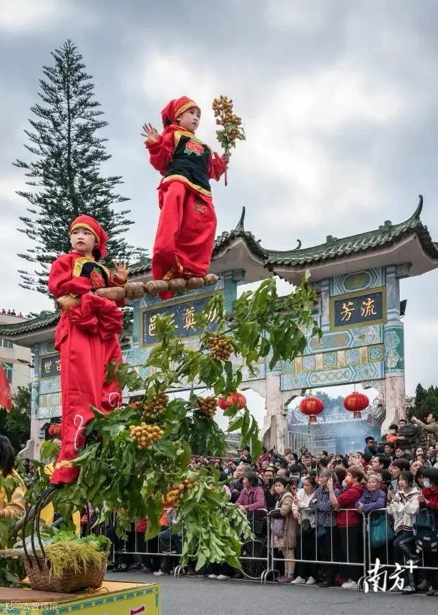 每逢春节,在云浮市郁南县连滩镇的民间艺术巡游中,多条街道都会变得热闹非凡。在唢呐声和歌舞声中,飘色巡游队伍浩浩荡荡地穿过街道,表演者们服饰艳丽、造型各异,犹如凌空而立。
