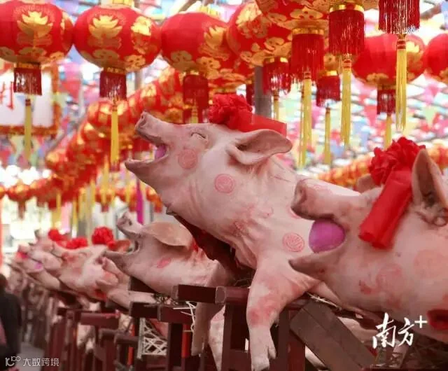 五六百斤重的猪猪头戴大红花,嘴衔苹果,背上印着象征吉祥的大红印,成排成列面朝祠堂分布,以祈求新的一年五谷丰登、六畜兴旺、国泰民安。这是潮汕特色民俗——“赛大猪”。