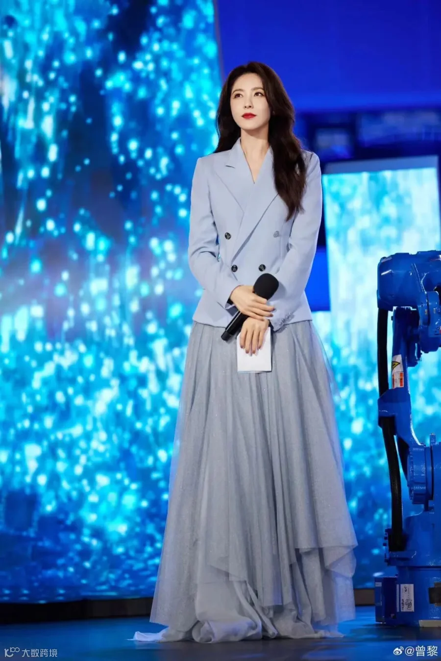 曾黎身着浅蓝色西装搭配纱裙,台风大气明快,气场十足。