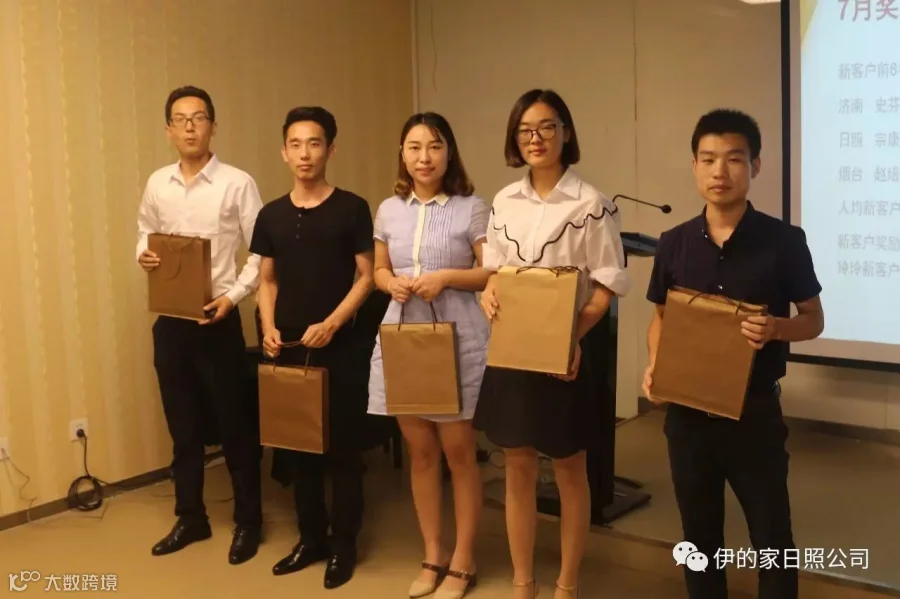 倩姐为七月新客户进入前八名的日照优秀员工颁发礼品奖励,他们分别是宗康康、董和鹏、许寒、程玲玲、尹旭。