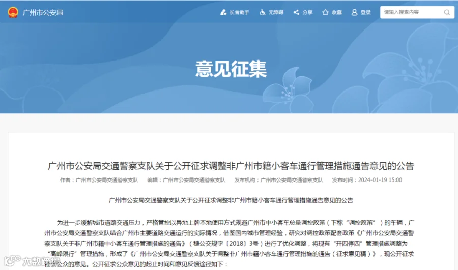 《广州市公安局交通警察支队关于调整非广州市籍小客车通行管理措施的通告(征求意见稿)》。