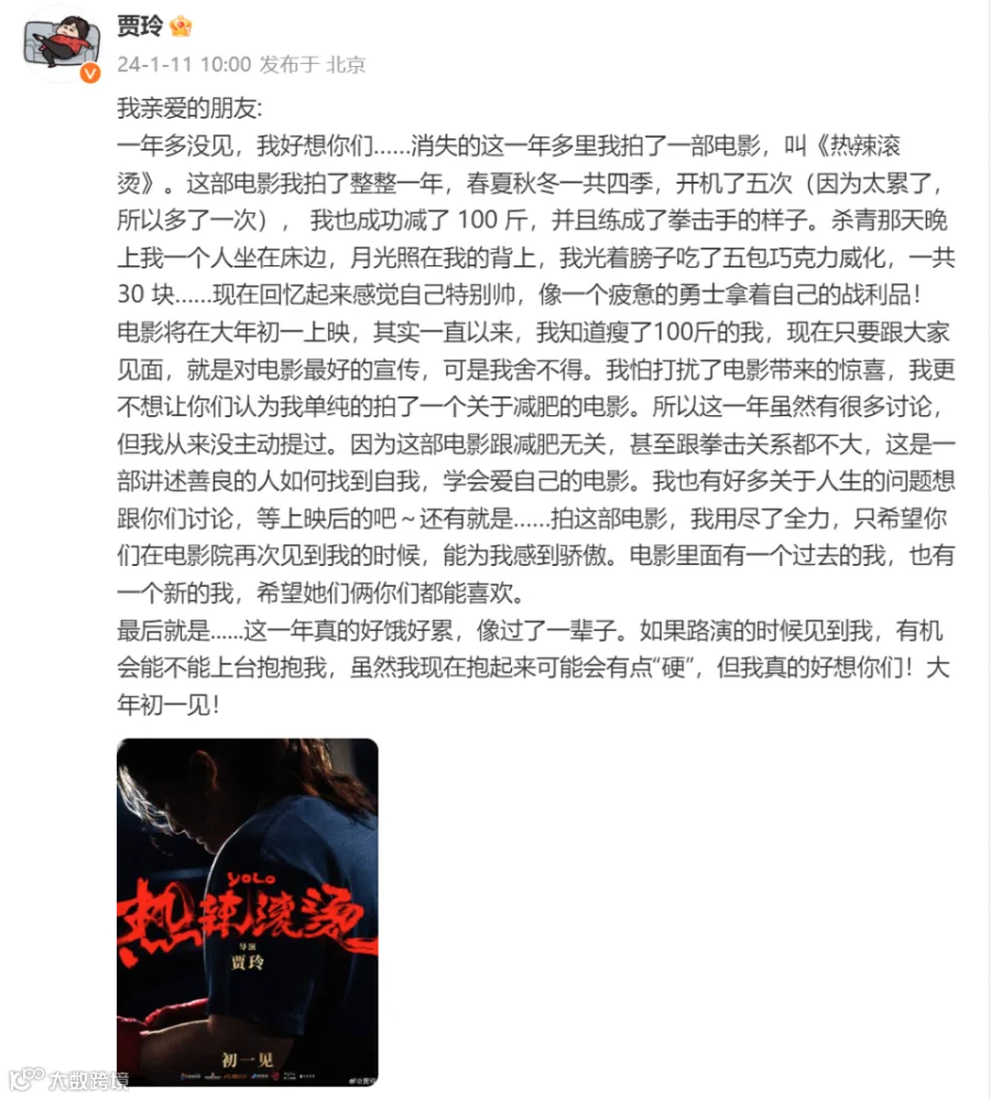 电影将在大年初一上映,其实一直以来,我知道瘦了100斤的我,现在只要跟大家见面,就是对电影最好的宣传,可是我舍不得。我怕打扰了电影带来的惊喜,我更不想让你们认为我单纯的拍了一个关于减肥的电影。所以这一年虽然有很多讨论,但我从来没主动提过。因为这部电影跟减肥无关,甚至跟拳击关系都不大,这是一部讲述善良的人如何找到自我,学会爱自己的电影。我也有好多关于人生的问题想跟你们讨论,等上映后的吧~还有就是……拍这部电影,我用尽了全力,只希望你们在电影院再次见到我的时候,能为我感到骄傲。电影里面有一个过去的我,也有一个新的我,希望她们俩你们都能喜欢。