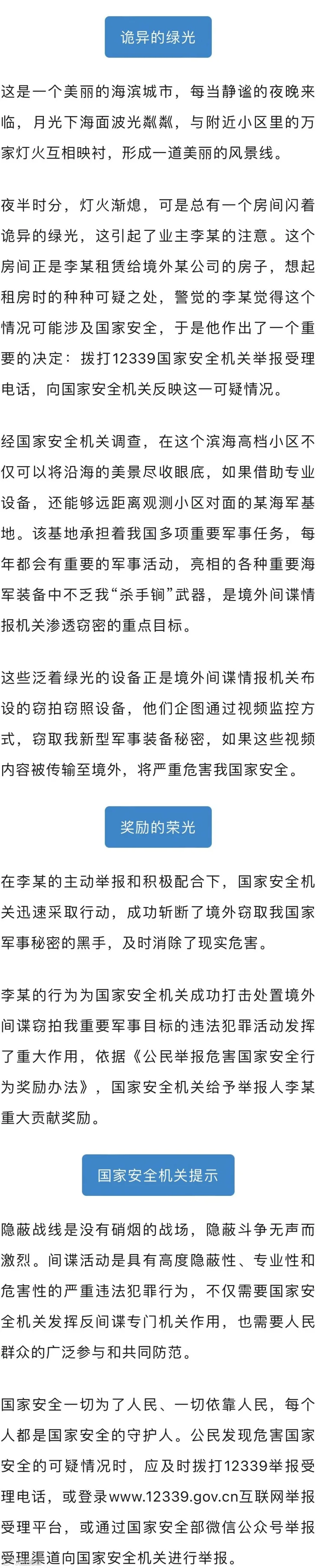 这是某市国家安全机关接到的群众举报电话内容,“打电话的是谁?”“发着绿光的又是什么?”请跟随我们一探究竟。