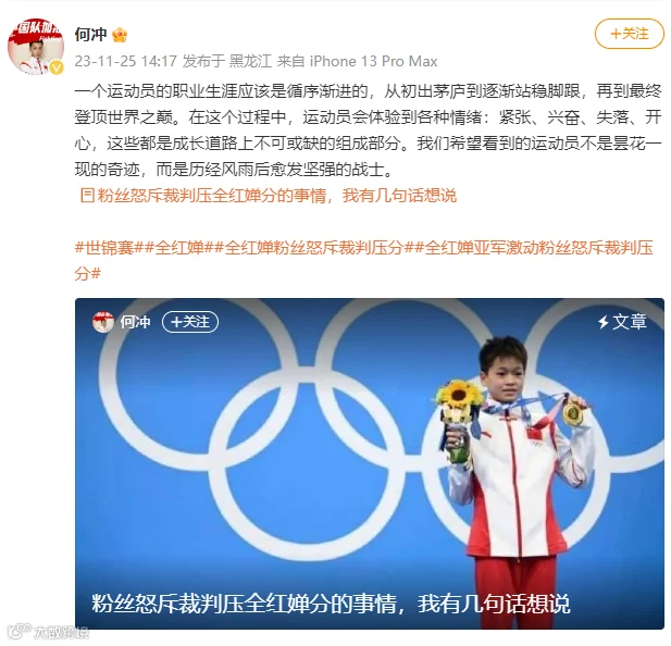 奥运跳水冠军、全红婵的湛江老乡、中国跳水名将何冲于11月25日深夜发表长文,怒斥饭圈行径,批驳了“压分”的谬论。