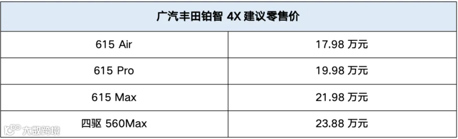 12月23日起,广汽丰田新能源全新品牌“铂智”首款纯电SUV,铂智4X全面到店。新车共推出615 Air、615 Pro、615 Max和四驱560Max四个配置版本,厂商建议零售价为17.98万-23.88万元。