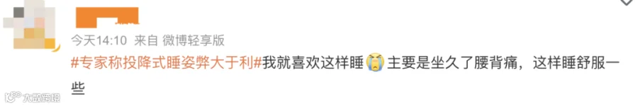 武汉市东湖医院康复科主治医师刘丽介绍,“投降式睡姿”是指婴儿睡觉时最常用的睡姿,和胎儿在子宫中的姿势相似,这和在子宫中蜷缩形成的惯性有关,主要是本能反应,属于正常现象。而成年人的“投降式睡姿”是指平躺睡觉时将双手举过头顶的姿势,则属于不良睡姿。这个姿势的弊远大于利,长时间保持会对身体带来多方面的影响。