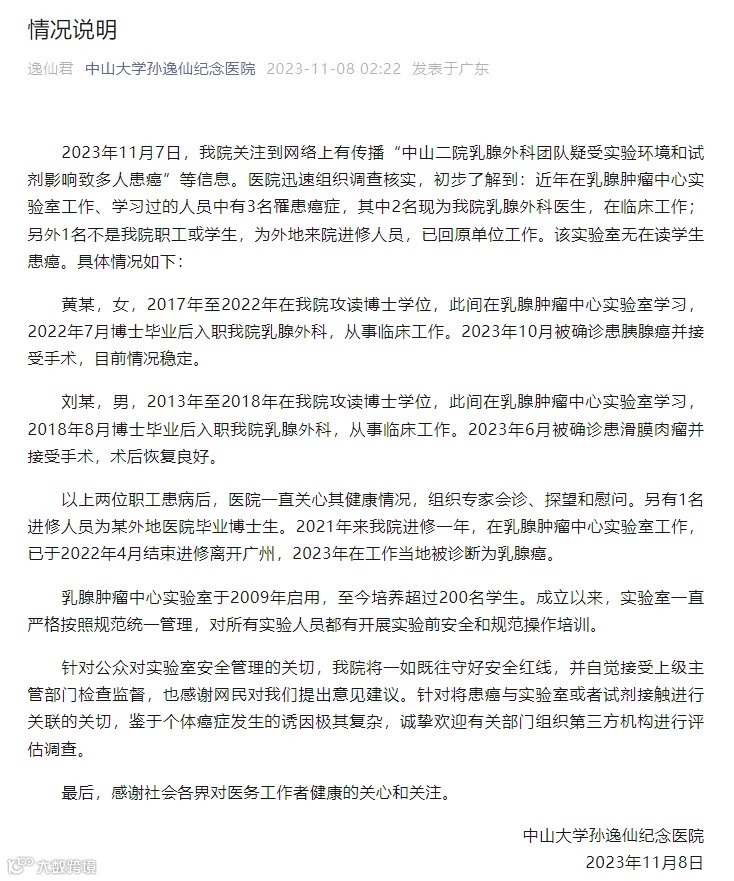 11月8日,中山大学孙逸仙纪念医院官方发布《情况说明》,回应了网络上有关“中山二院乳腺外科团队疑受实验环境和试剂影响致多人患癌”的信息。医院表示,近年在医院乳腺肿瘤中心实验室工作、学习过的人员中有3名罹患癌症,无在读学生患癌。针对将患癌与实验室或者试剂接触进行关联的关切,鉴于个体癌症发生的诱因极其复杂,诚挚欢迎有关部门组织第三方机构进行评估调查。